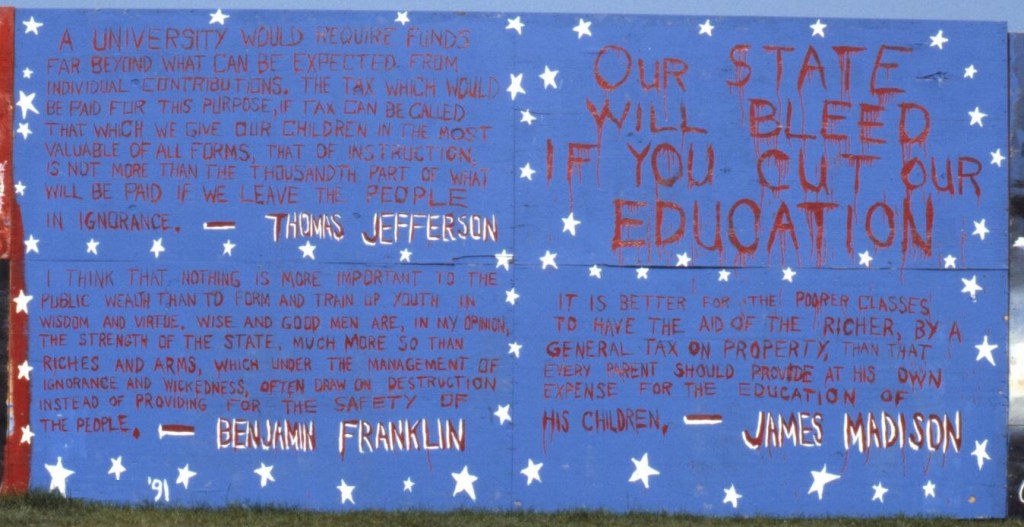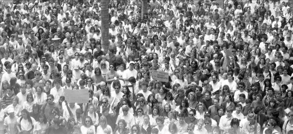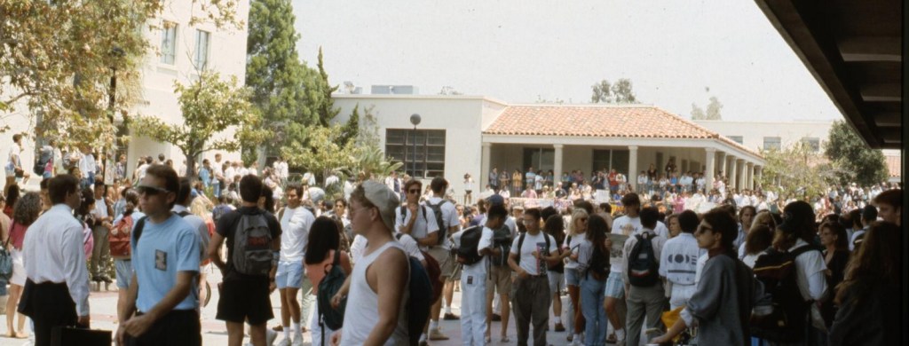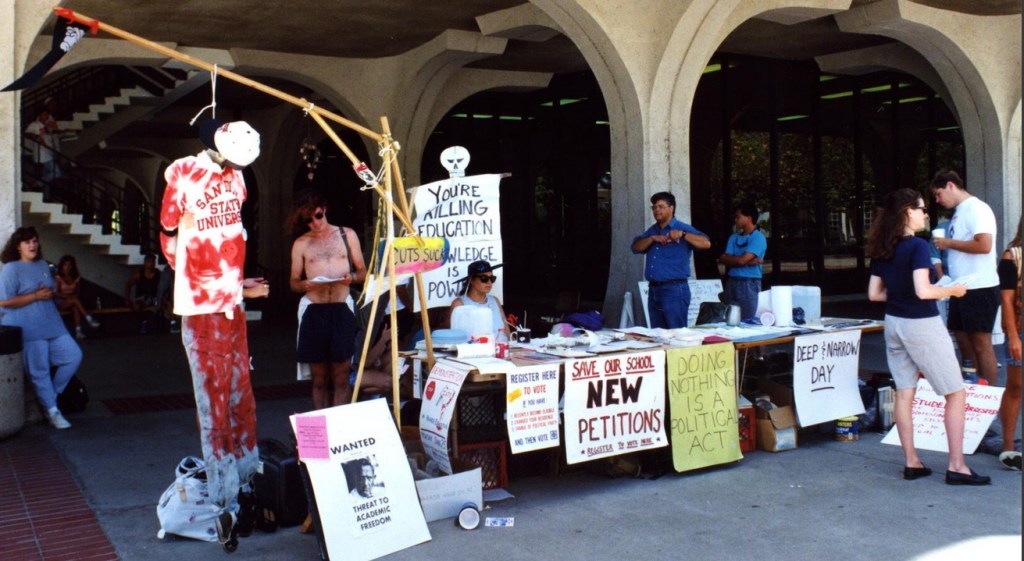 Spring of 1991 brought large fee increases and budget cuts by the governor and state legislature to the California State University (CSU) and University of California (UC) systems impacted SDSU in a unique way. While other schools in the systems chose an across the board approach on campus, the president of SDSU at the time, Thomas Day, chose to use a “deep and narrow” approach to program cuts. The result were largest student marches and protests since the Vietnam war.