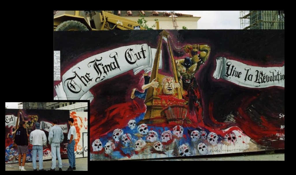 In May 1994, the student government dedicated a permanent memorial to the wall in Pfiefer Lounge (later a Starbucks and now the new Student Center) a few yards from the wall’s edge. The student memorial to the protests included the wall painting of President Day’s head in a guillotine.