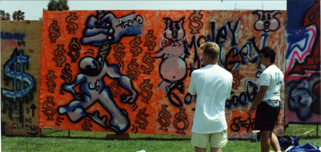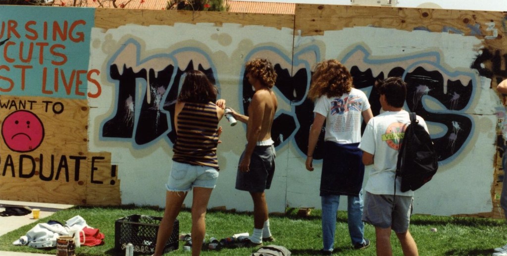 Central and parallel to the SDSU student protest movement was an 8 foot high wooden construction fence that encircled a new campus building. Students quickly put up protest messages, paintings, and cartoons urging students to rally, vote, and challenge the school president. Citing a need to “clean up” the campus during graduation of 1991, President Day attempted to paint over the now symbolic construction fence wall. The night before the attempted wall paint over by President Day, a large police force arrested eight students peacefully sitting in front of the wall. The next morning, word quickly gathered on campus about the arrests and dozens of student rushed to sit in front of the wall ultimately stopping the painters.